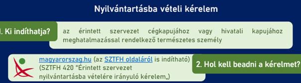 A 3-5 pontokban meghatározott információk összeállítása után a magyaorszag.hu SZTFH 420 „Érintett szervezet nyilvántartásba vételére irányuló kérelem” beadásával.