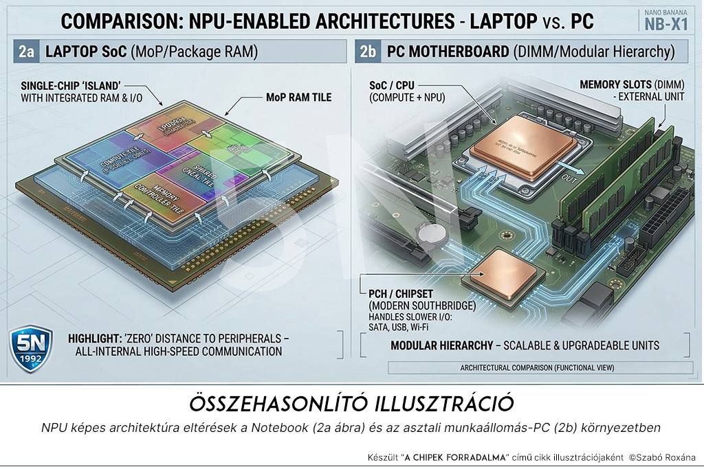 Ebben a fejezetben érünk el az első generációs modern architektúrák legfájóbb kompromisszumához: a bővíthetőség és a sebesség közötti kényszerű választáshoz. Ahogy az korábban már kiderült, az NPU „élete” a sávszélességen múlik. A mérnököknek tehát el kellett dönteniük, hova tegyék a RAM-ot, hogy az AI ne „fulladjon meg”.