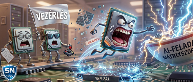 Az NPU-k speciális „étvággyal” rendelkeznek: dinamikus „bursty workload” jellemzi őket. Egy AI-feladat elindításakor az egység nanoszekundumok alatt ugrik alvó állapotból maximum terhelésre. A nagy áramtüskék kezeléséhez masszívabb VRM és induktorok kellenek. Ha a feszültségszabályozás (VRM) „zajos” vagy lassú, az NPU számítási hibákat véthet a mátrixszorzásoknál, vagy egyszerűen instabillá válik.