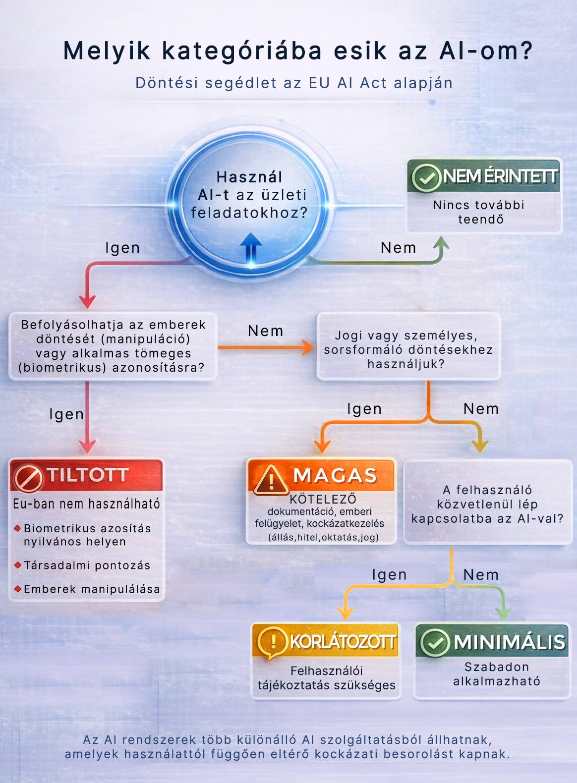 Az AI Act az első átfogó, kötelező erejű AI szabályozás, a GDPR-hoz hasonló logikai alapokon. Célja, hogy a mesterséges intelligencia használatát biztonságossá és etikussá tegye az EU-ban. A megközelítés kockázat alapú: minél veszélyesebb kategóriába sorolják a használatot, annál több szabály vonatkozik rá. Ugyanaz a GPAI vagy Foundation modell többféle szolgáltatást is biztosíthat – ezek besorolása használat szerint eltérő lehet.