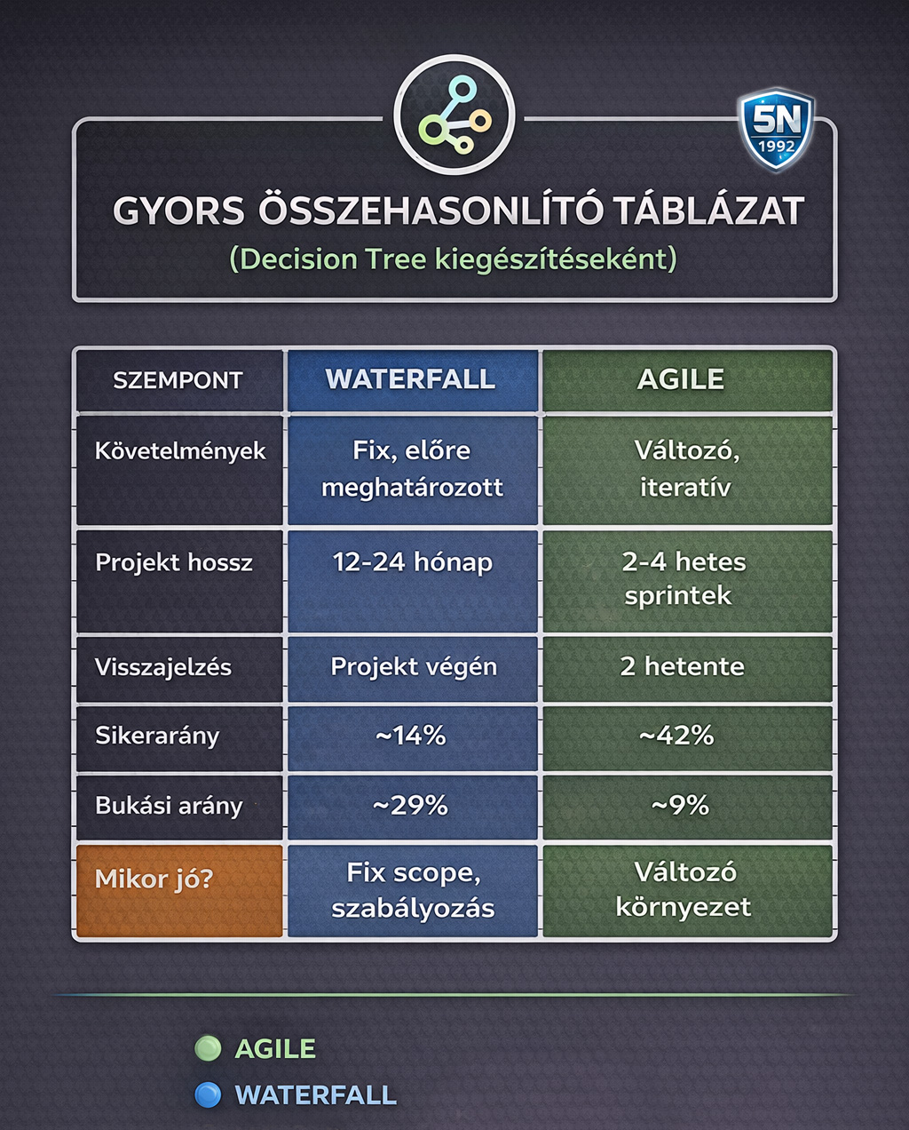 - Sikeres (Success - ~30-35%): Határidőre, költségkereten belül, és a kért funkciókkal készült el.