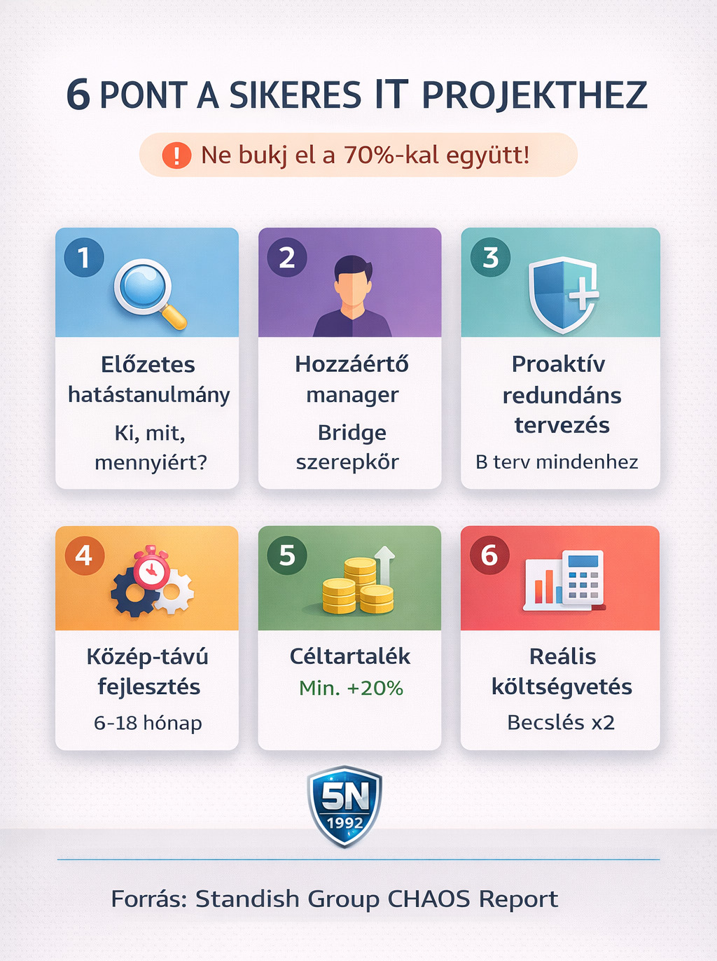 ÖSSZEFOGLALVA: Egy IT projekt sikere NEM a legütősebb technológiai környezeten (tech stack) múlik, hanem az átgondolt tervezésen, a reális elvárásokon és a proaktív kockázatkezelésen. A fenti szempontok alkalmazásával drasztikusan csökken a bukási arány kockázata.